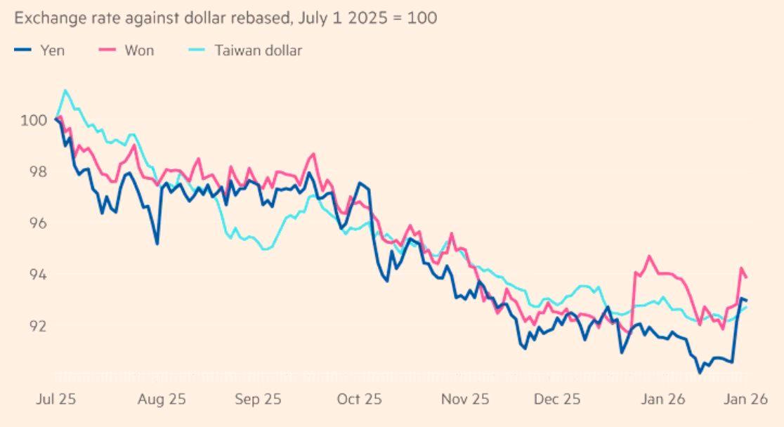 Cụ thể, bước sang đầu năm 2026, đồng yên Nhật và đồng won Hàn Quốc vẫn quanh quẩn ở vùng thấp nhất trong nhiều thập kỷ. Đồng Tân Đài tệ của Đài Loan (Trung Quốc) cũng đã đánh mất phần lớn mức tăng đạt được hồi tháng 5 năm ngoái. Điều này diễn ra ngay cả khi USD suy yếu rõ rệt so với các đồng tiền chủ chốt khác trong nhóm G7, như euro hay bảng Anh.