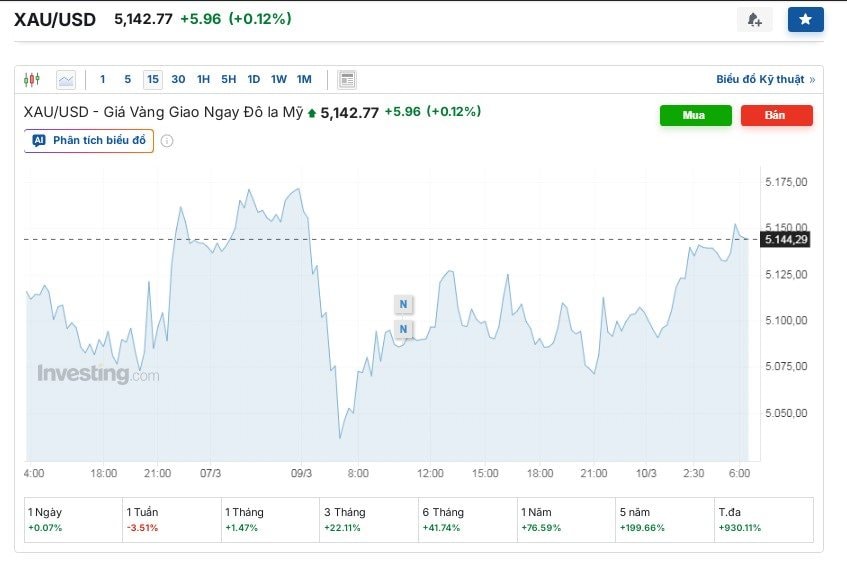 Trên nền tảng dữ liệu của Investing.com, giá vàng sau đó hồi phục nhẹ lên vùng 5.142 USD/ounce, song vẫn thấp hơn đáng kể so với vùng đỉnh gần 5.400 USD/ounce thiết lập chỉ vài ngày trước.