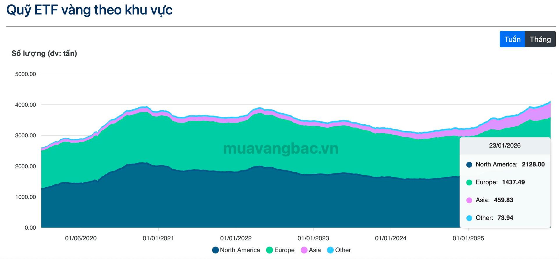 Xét theo khu vực, Bắc Mỹ và châu Âu vẫn là hai thị trường nắm giữ lượng vàng ETF lớn nhất toàn cầu.